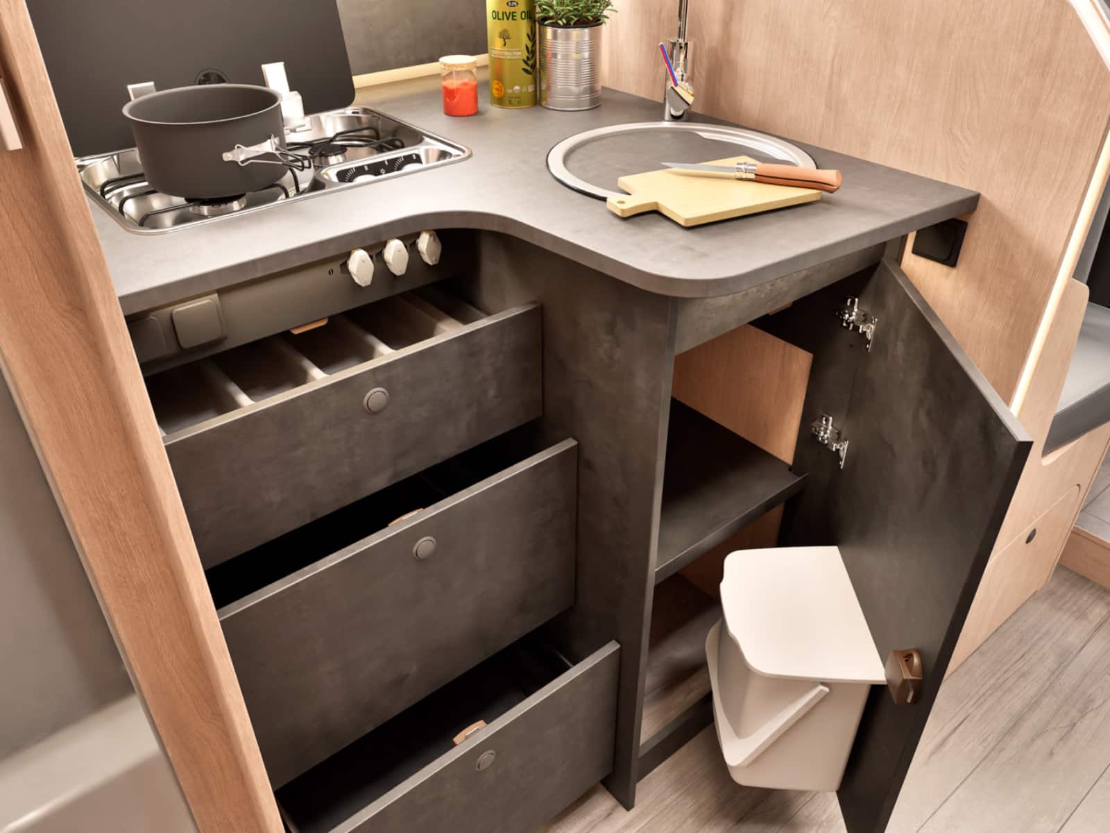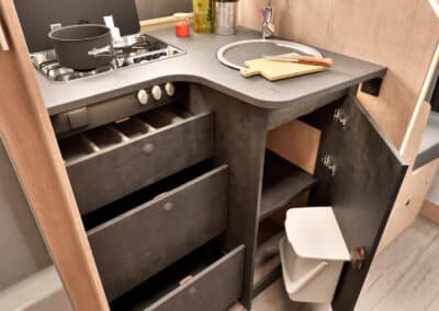 - Alle Wohnmobile sind mit Geschirr, Topfset und Pfanne ausgestattet.
